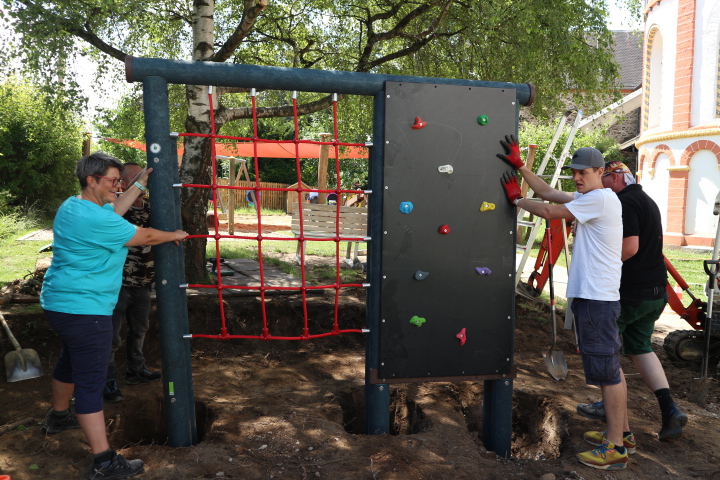 Die beiden neuen Spielgeräte, eine Kletterwand und eine Drehspiel-Pirouette, wurden montiert, der Sandspielbereich wurde gesäubert, Spielhaus und Zaun wurden neu angestrichen, Steinfliesen gesäubert und diverse andere Arbeiten verrichtet.
