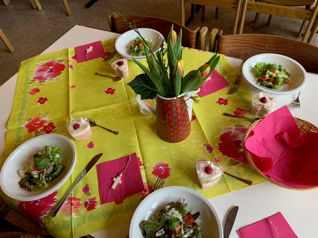 Zuerst essen wir alle gemeinsam, dann gibt es einen kurzen thematischen Impuls, danach geht es ins Gespräch in den Kleingruppen.