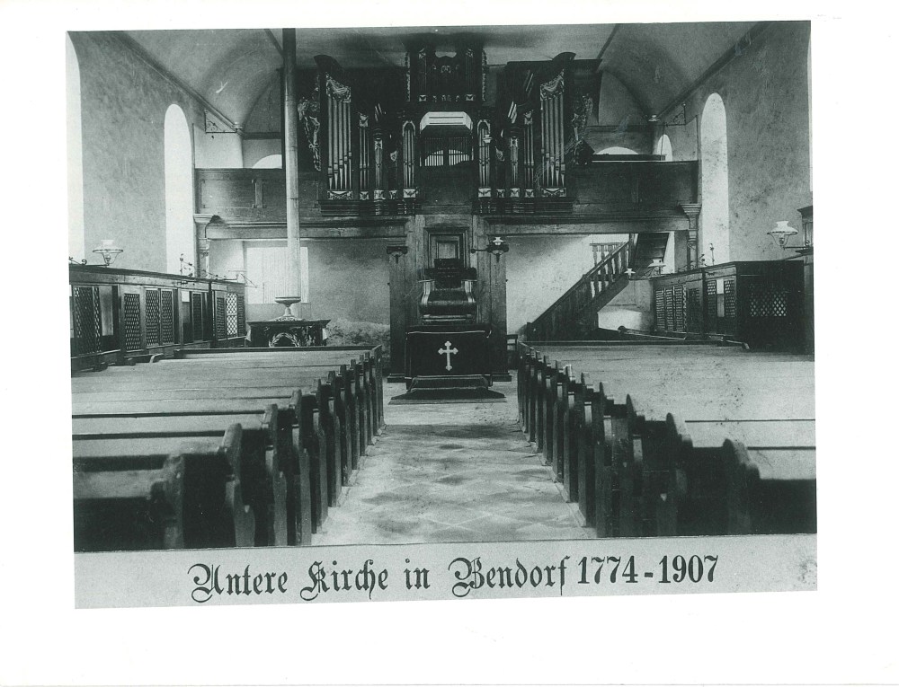 Farbfotografie. Dieses Bild, aufgenommen am 11. Oktober 1977, zeigt den evangelischen Gemeindesaal, gelegen in der Unteren Vallendarer Straße in Bendorf am Rhein. Schwarzweißfotografie versehen mit der Aufschrift „Untere Kirche in Bendorf 1774-1907“ am unteren Bildrand. Diese Aufnahme zeigt eine Innenansicht der ehemaligen, im Jahre 1773/74 von den Remy’s erbauten „Unteren Kirche der Reformierten“, in der Unteren Vallendarer Straße in Bendorf am Rhein. Heute befindet sich in diesem Gebäude der evangelische Gemeindesaal.
