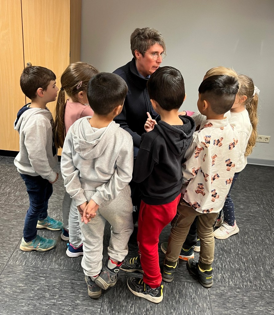 Ein besonderes Highlight ist der jährliche Besuch der Polizei. In drei Treffen lernen die Kinder eine „echte Polizistin“, Frau Tanja Hoppen von der Polizeiinspektion Bendorf, kennen. Es ist aufregend und sehr interessant, manches über die Arbeit der Polizei zu erfahren und die Ausrüstung einer Polizistin wie Handschellen, Funkgerät und Pistole kennenzulernen. Auch Verkehrserziehung spielt eine wichtige Rolle bei den Treffen. Frau Hoppen vermittelte den Kindern das richtige Verhalten im Straßenverkehr sowie die Wichtigkeit eines Kinderautositzes. Das Gelernte wurde in der Praxis umgesetzt und geübt. Mit einer richtigen Polizistin unterwegs zu sein machte den Kindern sehr viel Spaß.