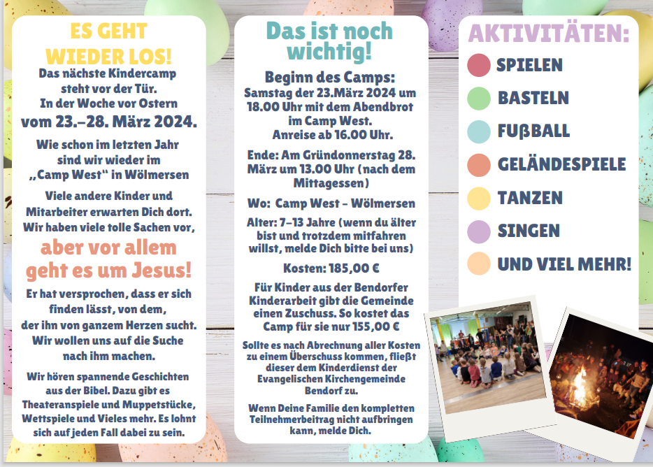 Lasst uns als Gemeinde das Kindercamp im Gebet begleiten.