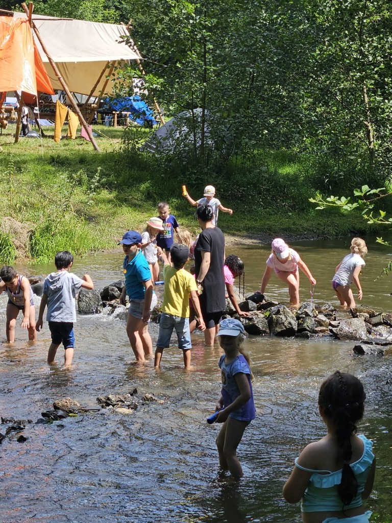 Dort angekommen, wurde das Schloss geöffnet und jedes Kind erhielt eine Medaille. Nach dem langen Marsch stärkten sich die Kinder, bevor sie das Gelände erkundeten und miteinander ins Spiel kamen. Natürlich war der Brexbach das interessanteste und so waren fast alle Kinder an diesem schönen Sommertag kurze Zeit später nass.