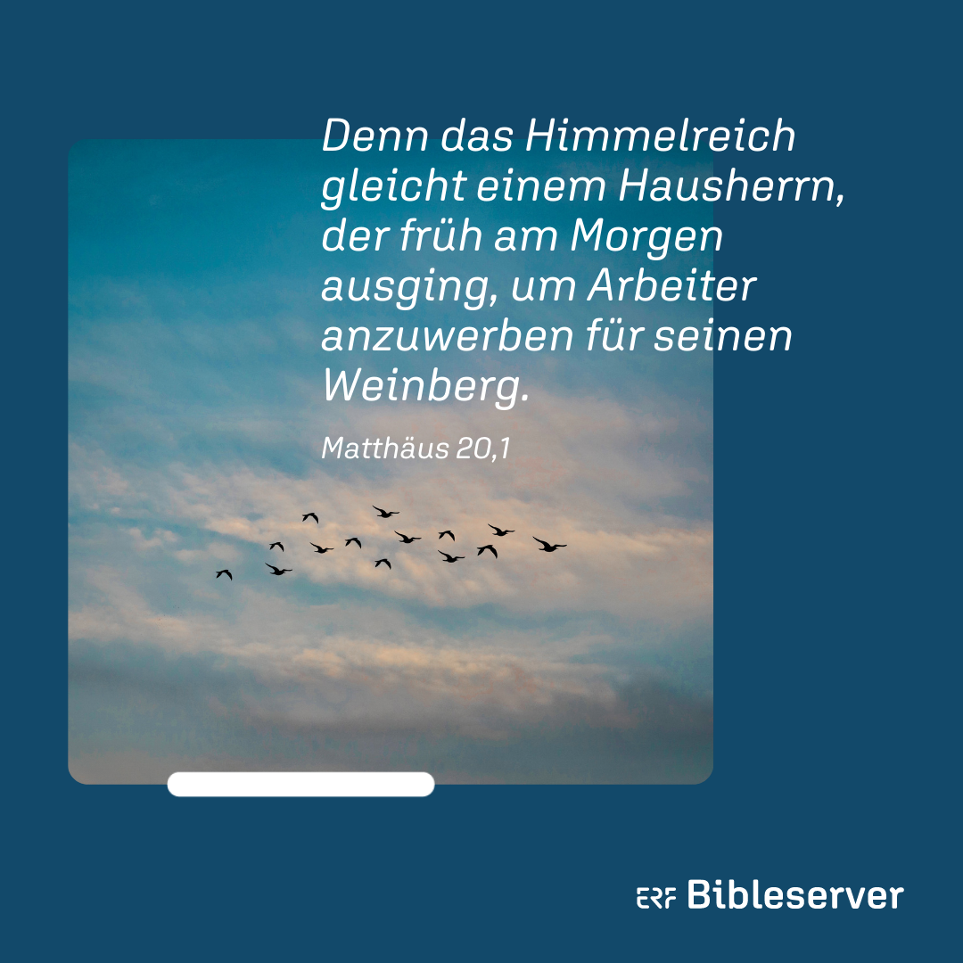 1 Denn das Himmelreich gleicht einem Hausherrn, der früh am Morgen ausging, um Arbeiter anzuwerben für seinen Weinberg. 2 Und als er mit den Arbeitern einig wurde über einen Silbergroschen als Tagelohn, sandte er sie in seinen Weinberg. 3 Und er ging aus um die dritte Stunde und sah andere auf dem Markt müßig stehen 4 und sprach zu ihnen: Geht ihr auch hin in den Weinberg; ich will euch geben, was recht ist. 5 Und sie gingen hin. Abermals ging er aus um die sechste und um die neunte Stunde und tat dasselbe. 6 Um die elfte Stunde aber ging er aus und fand andere stehen und sprach zu ihnen: Was steht ihr den ganzen Tag müßig da? 7 Sie sprachen zu ihm: Es hat uns niemand angeworben. Er sprach zu ihnen: Geht ihr auch hin in den Weinberg. 8 Als es nun Abend wurde, sprach der Herr des Weinbergs zu seinem Verwalter: Ruf die Arbeiter und gib ihnen den Lohn und fang an bei den letzten bis zu den ersten. 9 Da kamen, die um die elfte Stunde angeworben waren, und jeder empfing seinen Silbergroschen. 10 Als aber die Ersten kamen, meinten sie, sie würden mehr empfangen; und sie empfingen auch ein jeder seinen Silbergroschen. 11 Und als sie den empfingen, murrten sie gegen den Hausherrn 12 und sprachen: Diese Letzten haben nur eine Stunde gearbeitet, doch du hast sie uns gleichgestellt, die wir des Tages Last und die Hitze getragen haben. 13 Er antwortete aber und sagte zu einem von ihnen: Mein Freund, ich tu dir nicht Unrecht. Bist du nicht mit mir einig geworden über einen Silbergroschen? 14 Nimm, was dein ist, und geh! Ich will aber diesem Letzten dasselbe geben wie dir. 15 Oder habe ich nicht Macht zu tun, was ich will, mit dem, was mein ist? Siehst du darum scheel, weil ich so gütig bin? 16 So werden die Letzten die Ersten und die Ersten die Letzten sein.