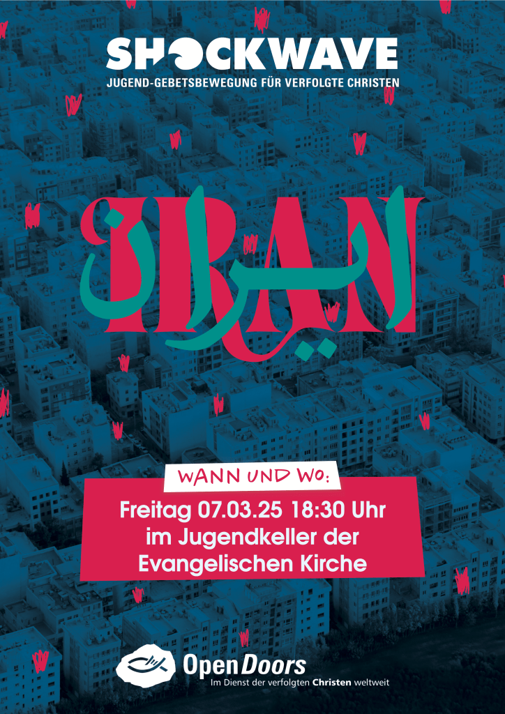 am 07.03.25 werden wir im Jugendtreff einen besonderen Abend haben, an dem wir für die verfolgten Christen beten. OpenDoors ist eine Organisation die sich für verfolgte Christen weltweit einsetzt. Einmal pro Jahr wird von OpenDoors ein Programm für Jugendgruppen entwickelt mit dem Ziel für verfolgte Christen in einem Land, dieses Jahr dem Iran, zu beten. Das Gebet aller Jugendgruppen Deutschlands wirkt sich wie eine Druckwelle (Shockwave) der Ermutigung und Veränderung aus.
