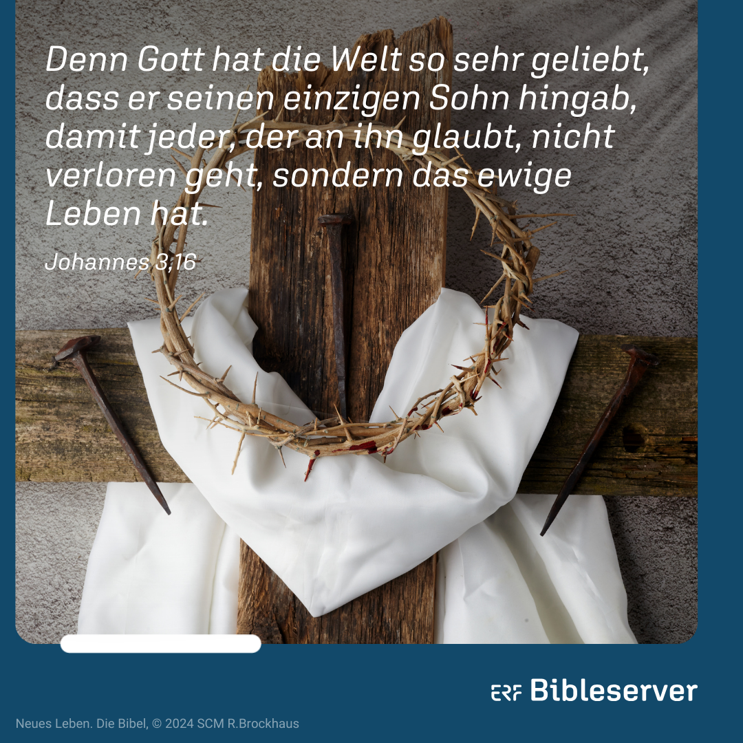 …14 Und wie Mose in der Wüste die Schlange erhöht hat, so muss der Menschensohn erhöht werden, 15 auf dass alle, die an ihn glauben, das ewige Leben haben. 16 Denn also hat Gott die Welt geliebt, dass er seinen eingeborenen Sohn gab, auf dass alle, die an ihn glauben, nicht verloren werden, sondern das ewige Leben haben. 17 Denn Gott hat seinen Sohn nicht in die Welt gesandt, dass er die Welt richte, sondern dass die Welt durch ihn gerettet werde. 18 Wer an ihn glaubt, der wird nicht gerichtet; wer aber nicht glaubt, der ist schon gerichtet, denn er hat nicht geglaubt an den Namen des eingeborenen Sohnes Gottes. 19 Das ist aber das Gericht, dass das Licht in die Welt gekommen ist, und die Menschen liebten die Finsternis mehr als das Licht, denn ihre Werke waren böse. 20 Wer Böses tut, der hasst das Licht und kommt nicht zu dem Licht, damit seine Werke nicht aufgedeckt werden. 21 Wer aber die Wahrheit tut, der kommt zu dem Licht, damit offenbar wird, dass seine Werke in Gott getan sind.