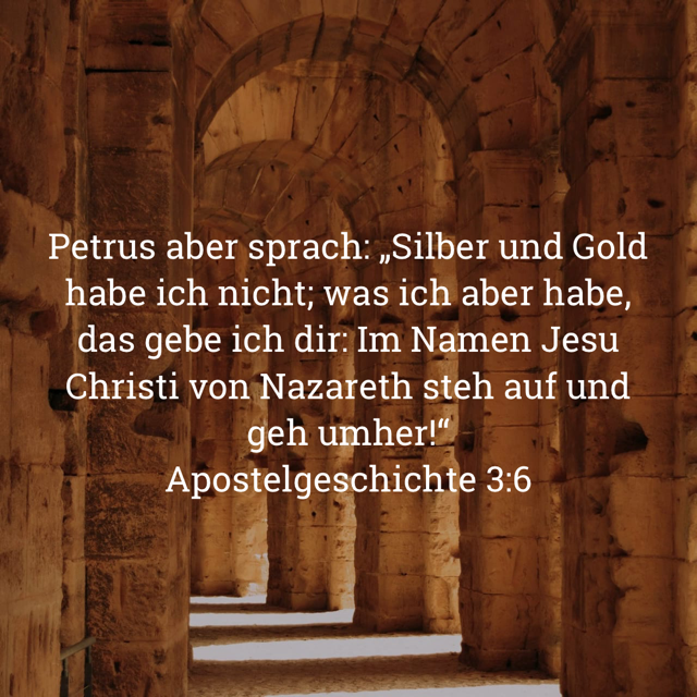 1 Einmal gingen Petrus und Johannes in den Tempel. Es war drei Uhr, die Zeit für das Nachmittagsgebet. 2 Am Schönen Tor des Tempelvorhofs saß ein Mann, der von Geburt an gelähmt war. Jeden Tag ließ er sich dorthin tragen und bettelte die Leute an, die in den Tempel gingen. 3 Als er Petrus und Johannes sah, wie sie gerade durch das Tor gehen wollten, bat er sie um eine Gabe. 4 Die beiden blickten ihn fest an und Petrus sagte: »Sieh uns an!« 5 Der Gelähmte tat es und erwartete, dass sie ihm etwas geben würden. 6 Aber Petrus sagte: »Gold und Silber habe ich nicht; doch was ich habe, will ich dir geben. Im Namen von Jesus Christus aus Nazaret:[1] Steh auf und geh umher!« 7 Und er fasste den Gelähmten bei der rechten Hand und half ihm auf. Im gleichen Augenblick erstarkten seine Füße und Knöchel; 8 mit einem Sprung war er auf den Beinen und ging umher. Er folgte Petrus und Johannes in den Vorhof des Tempels, lief umher, sprang vor Freude und dankte Gott mit lauter Stimme. 9 Das ganze Volk dort sah, wie er umherging und Gott dankte. 10 Sie erkannten in ihm den Bettler, der sonst immer am Schönen Tor gesessen hatte. Und sie staunten und waren ganz außer sich über das, was mit ihm geschehen war.
