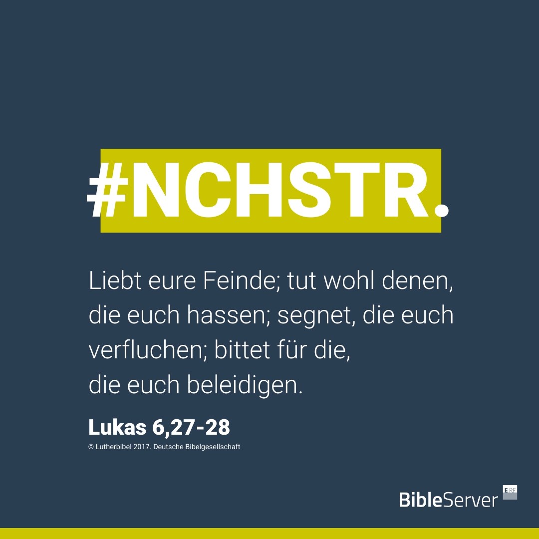 27 Aber ich sage euch, die ihr zuhört: Liebt eure Feinde; tut wohl denen, die euch hassen; 28 segnet, die euch verfluchen; bittet für die, die euch beleidigen. 29 Und wer dich auf die eine Backe schlägt, dem biete die andere auch dar; und wer dir den Mantel nimmt, dem verweigere auch den Rock nicht. 30 Wer dich bittet, dem gib; und wer dir das Deine nimmt, von dem fordere es nicht zurück. 31 Und wie ihr wollt, dass euch die Leute tun sollen, so tut ihnen auch! 32 Und wenn ihr liebt, die euch lieben, welchen Dank habt ihr davon? Denn auch die Sünder lieben, die ihnen Liebe erweisen. 33 Und wenn ihr euren Wohltätern wohltut, welchen Dank habt ihr davon? Das tun die Sünder auch. 34 Und wenn ihr denen leiht, von denen ihr etwas zu bekommen hofft, welchen Dank habt ihr davon? Auch Sünder leihen Sündern, damit sie das Gleiche zurückbekommen. 35 Vielmehr liebt eure Feinde und tut Gutes und leiht, ohne etwas dafür zu erhoffen. So wird euer Lohn groß sein, und ihr werdet Kinder des Höchsten sein; denn er ist gütig gegen die Undankbaren und Bösen. Vom Umgang mit dem Nächsten