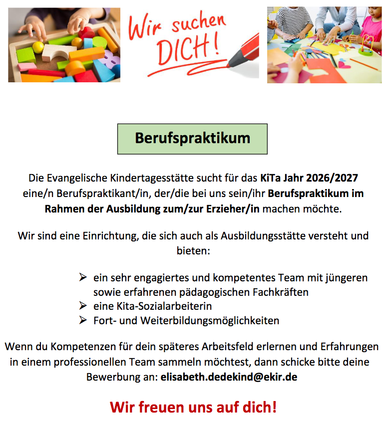 Die Evangelische Kindertagesstätte sucht für das KiTa Jahr 2026/2027 eine/n Berufspraktikant/in, der/die bei uns sein/ihr Berufspraktikum im Rahmen der Ausbildung zum/zur Erzieher/in machen möchte.