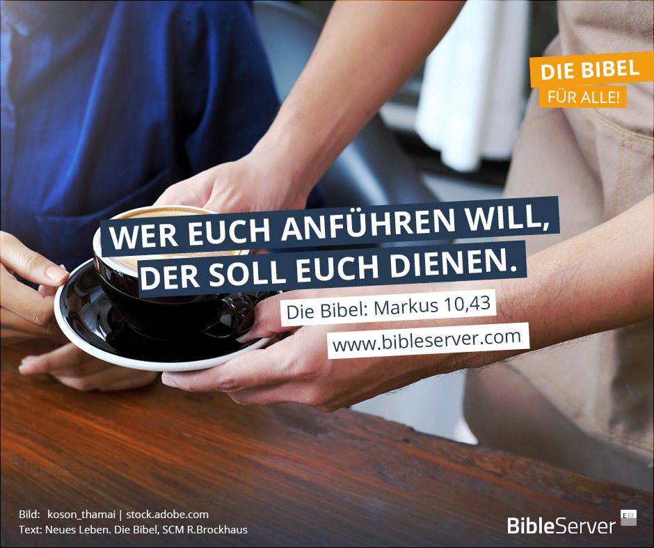 35 Da gingen zu ihm Jakobus und Johannes, die Söhne des Zebedäus, und sprachen zu ihm: Meister, wir wollen, dass du für uns tust, was wir dich bitten werden. 36 Er sprach zu ihnen: Was wollt ihr, dass ich für euch tue? 37 Sie sprachen zu ihm: Gib uns, dass wir sitzen einer zu deiner Rechten und einer zu deiner Linken in deiner Herrlichkeit. 38 Jesus aber sprach zu ihnen: Ihr wisst nicht, was ihr bittet. Könnt ihr den Kelch trinken, den ich trinke, oder euch taufen lassen mit der Taufe, mit der ich getauft werde? 39 Sie sprachen zu ihm: Ja, das können wir. Jesus aber sprach zu ihnen: Ihr werdet zwar den Kelch trinken, den ich trinke, und getauft werden mit der Taufe, mit der ich getauft werde; 40 zu sitzen aber zu meiner Rechten oder zu meiner Linken, das zu geben steht mir nicht zu, sondern das wird denen zuteil, für die es bestimmt ist. 41 Und als das die Zehn hörten, wurden sie unwillig über Jakobus und Johannes. 42 Da rief Jesus sie zu sich und sprach zu ihnen: Ihr wisst, die als Herrscher gelten, halten ihre Völker nieder, und ihre Mächtigen tun ihnen Gewalt an. 43 Aber so ist es unter euch nicht; sondern wer groß sein will unter euch, der soll euer Diener sein; 44 und wer unter euch der Erste sein will, der soll aller Knecht sein. 45 Denn auch der Menschensohn ist nicht gekommen, dass er sich dienen lasse, sondern dass er diene und sein Leben gebe als Lösegeld für viele.
