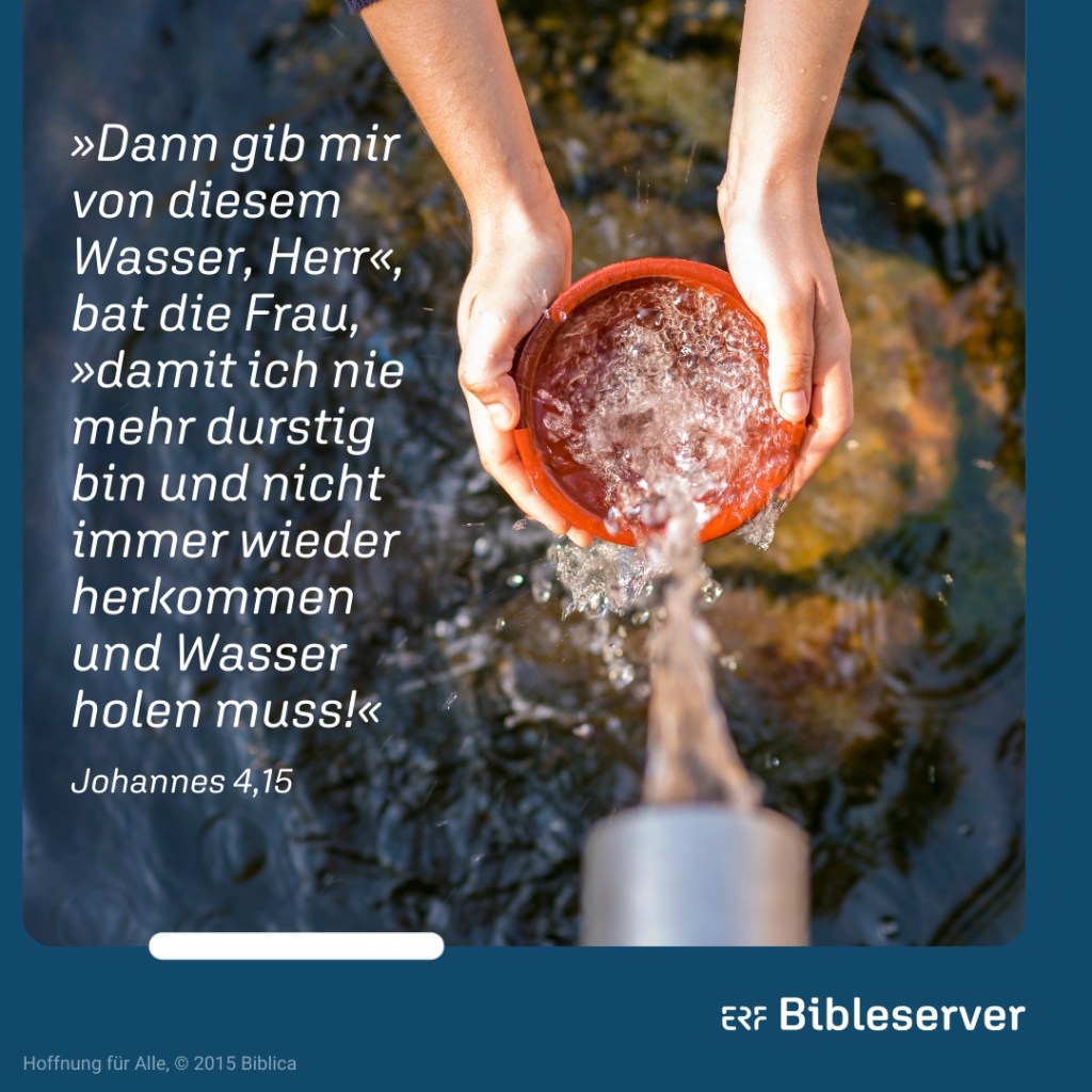 5 Da kam er in eine Stadt Samariens, die heißt Sychar, nahe bei dem Feld, das Jakob seinem Sohn Josef gegeben hatte. 6 Es war aber dort Jakobs Brunnen. Weil nun Jesus müde war von der Reise, setzte er sich an den Brunnen; es war um die sechste Stunde. 7 Da kommt eine Frau aus Samarien, um Wasser zu schöpfen. Jesus spricht zu ihr: Gib mir zu trinken! 8 Denn seine Jünger waren in die Stadt gegangen, um Speise zu kaufen. 9 Da spricht die samaritische Frau zu ihm: Wie, du, ein Jude, erbittest etwas zu trinken von mir, einer samaritischen Frau? Denn die Juden haben keine Gemeinschaft mit den Samaritern. – 10 Jesus antwortete und sprach zu ihr: Wenn du erkenntest die Gabe Gottes und wer der ist, der zu dir sagt: Gib mir zu trinken!, du bätest ihn, und er gäbe dir lebendiges Wasser. 11 Spricht zu ihm die Frau: Herr, du hast doch nichts, womit du schöpfen könntest, und der Brunnen ist tief; woher hast du denn lebendiges Wasser? 12 Bist du etwa mehr als unser Vater Jakob, der uns diesen Brunnen gegeben hat? Und er hat daraus getrunken und seine Söhne und sein Vieh. 13 Jesus antwortete und sprach zu ihr: Wer von diesem Wasser trinkt, den wird wieder dürsten; 14 wer aber von dem Wasser trinkt, das ich ihm gebe, den wird in Ewigkeit nicht dürsten, sondern das Wasser, das ich ihm geben werde, das wird in ihm eine Quelle des Wassers werden, das in das ewige Leben quillt. 15 Spricht die Frau zu ihm: Herr, gib mir dieses Wasser, damit mich nicht dürstet und ich nicht herkommen muss, um zu schöpfen! 16 Spricht er zu ihr: Geh hin, ruf deinen Mann und komm wieder her! 17 Die Frau antwortete und sprach zu ihm: Ich habe keinen Mann. Jesus spricht zu ihr: Du hast richtig gesagt: »Ich habe keinen Mann.« 18 Denn fünf Männer hast du gehabt, und der, den du jetzt hast, ist nicht dein Mann; das hast du recht gesagt. 19 Die Frau spricht zu ihm: Herr, ich sehe, dass du ein Prophet bist. 20 Unsere Väter haben auf diesem Berge angebetet, und ihr sagt, in Jerusalem sei die Stätte, wo man anbeten soll. 21 Jesus spricht zu ihr: Glaube mir, Frau, es kommt die Zeit, dass ihr weder auf diesem Berge noch in Jerusalem den Vater anbeten werdet. 22 Ihr betet an, was ihr nicht kennt; wir beten an, was wir kennen; denn das Heil kommt von den Juden. 23 Aber es kommt die Stunde und ist schon jetzt, dass die wahren Anbeter den Vater anbeten werden im Geist und in der Wahrheit; denn auch der Vater will solche Anbeter haben. 24 Gott ist Geist, und die ihn anbeten, die müssen ihn im Geist und in der Wahrheit anbeten. 25 Spricht die Frau zu ihm: Ich weiß, dass der Messias kommt, der da Christus heißt. Wenn dieser kommt, wird er uns alles verkündigen. 26 Jesus spricht zu ihr: Ich bin’s, der mit dir redet. 27 Unterdessen kamen seine Jünger, und sie wunderten sich, dass er mit einer Frau redete; doch sagte niemand: Was willst du?, oder: Was redest du mit ihr? 28 Da ließ die Frau ihren Krug stehen und ging hin in die Stadt und spricht zu den Leuten: 29 Kommt, seht einen Menschen, der mir alles gesagt hat, was ich getan habe, ob er nicht der Christus sei!